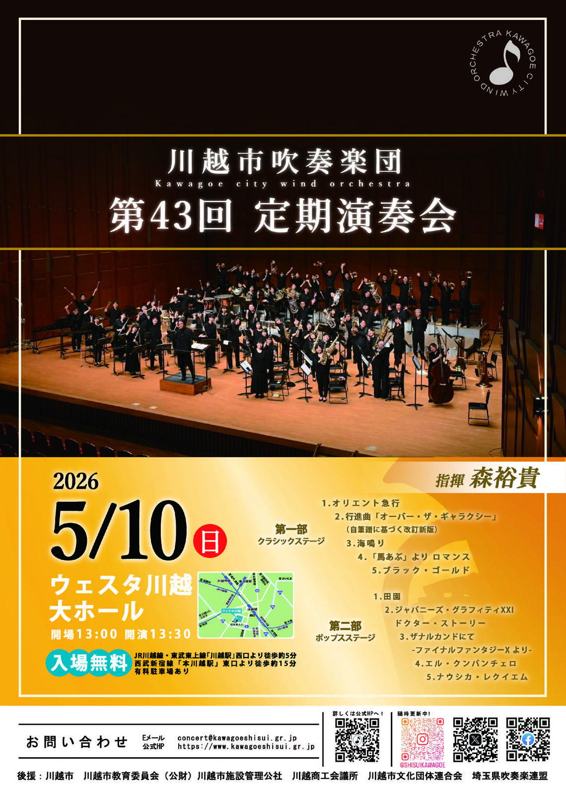 以下のとおり、川越市吹奏楽団 第43回定期演奏会を開催します。皆様のご来場を心よりお待ちしております。